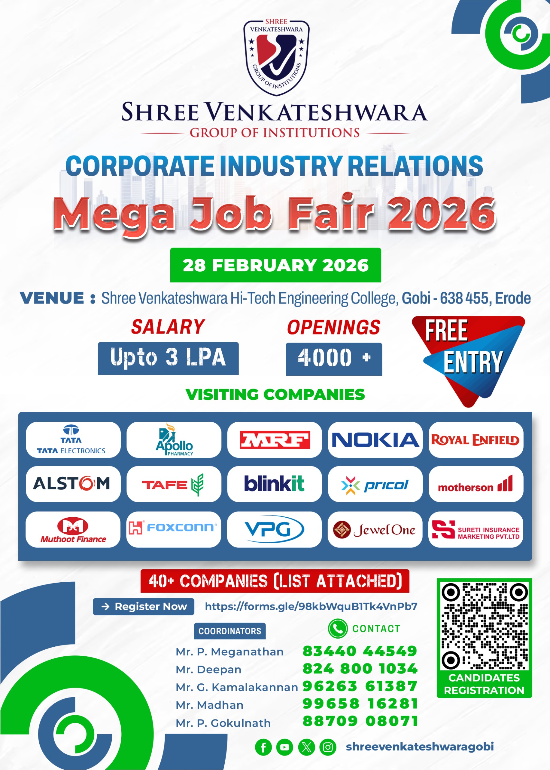 Shree Venkateshwara Hi-tech Engineering College (SVHEC) is approved by AICTE and Affiliated to Anna University, Tamil Nadu. The Institution provides various facilities for successful implementation of curriculum to meet the vision, mission, objectives and goals.